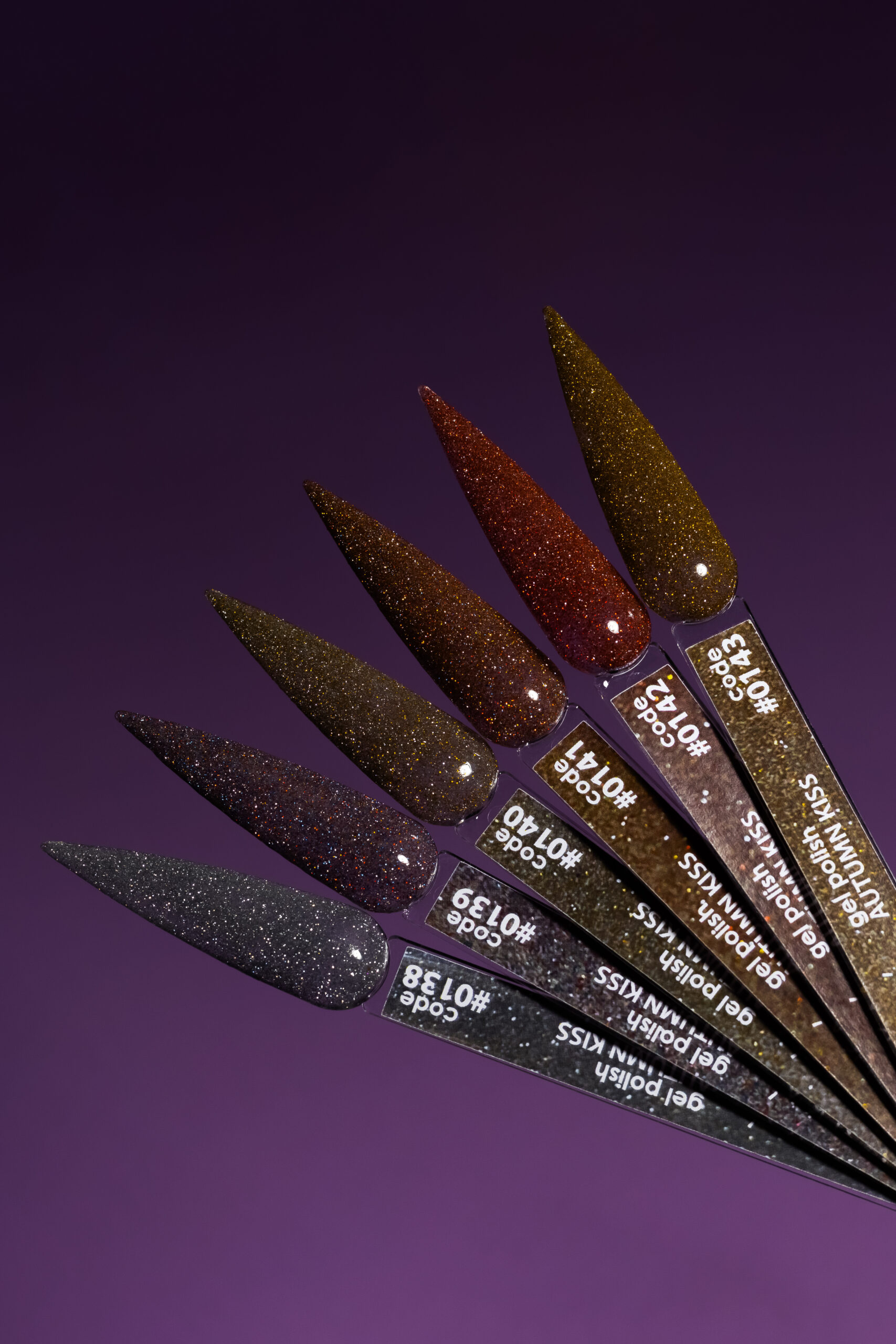 Kolekcja intensywnie połyskujących, witrażowych odcieni lakierów hybrydowych, idealnych na jesienne dni. Kolekcja „Autumn Kiss” to połączenie elegancji i romantyzmu z delikatnym jesiennym blaskiem. Te odcienie, inspirowane ciepłymi, przytulnymi kolorami zmieniającej się natury, otulają paznokcie subtelnym kolorem i nadają im niepowtarzalny blask. Lakiery hybrydowe z tej kolekcji mają średnią konsystencję, wzbogaconą brokatem i kryształkami z efektem „flash”, które odbijają światło jak księżyc na spokojnym, nocnym niebie.